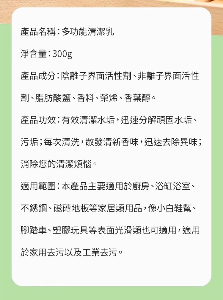 25分鐘前【太牛了!】日本多功能强效清潔乳,溫和不刺激! 火爆熱銷中!一噴一擦,強力去除水垢/油污/皂漬 - 【超夯活動】買一送二 3入組-NT$998